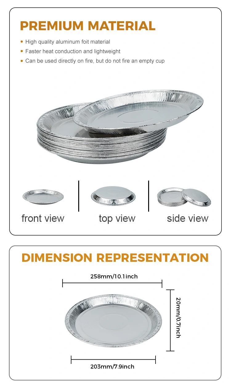 ​Yunchu Aluminum Foil offers a 10 Inches Pizza Pan Silver Aluminum Foil Containers with model number 13110. The product has an upper diameter of 258 mm (about 10.1 inches), a lower diameter of 203 mm (about 7.9 inches), and a height of 20 mm (about 0.7 inches). Cum facultatem circiter DCXCV ml (circiter 24.5 uncias), idoneam ad pistoria pizza non haerentem, facile dimittere a fingunt, et non habet odorem. Insuper et elevata ora consilio prohibet ingredients ex effundendo et crescit practicality. Non possumus etiam providere logo customization servicia ad auxilium vobis deepen vestri teloneariorum, impressionem et augendae vestra notam conscientia.