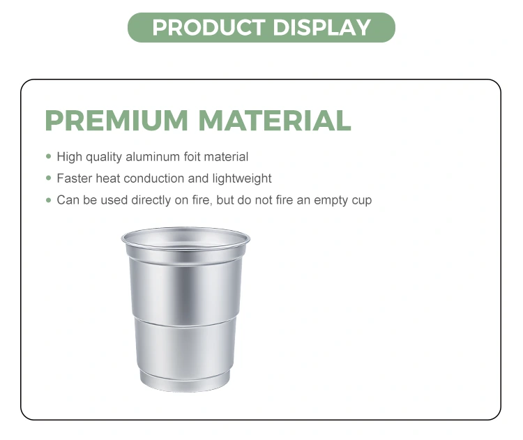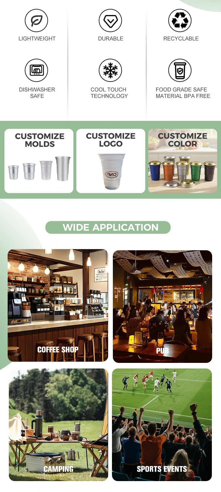 Missiones commerciales activitatem: exhibitiones, conferentias premunt, negotiatio tea frangit et alias occasiones. Hoc aluminium potiones ad potiones utendum est ut aqua mineralis et aqua micans. Est levis et facilis, eiusque recyclable attributum viridis officii societas aptat imaginem. Adhiberi potest ad parandum mini cocktails, cupam tene, etc. in vectibus et in vectibus lucidis. Calix metallicus corpus cito frigiditatem traducere potest, gustum glaciei-frigidi potus augere, et simul ad nightclub atmosphaeram modum modum addere.