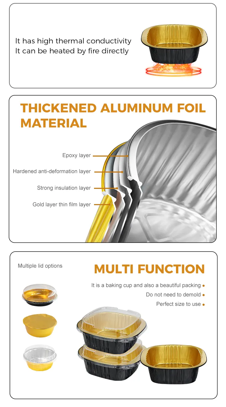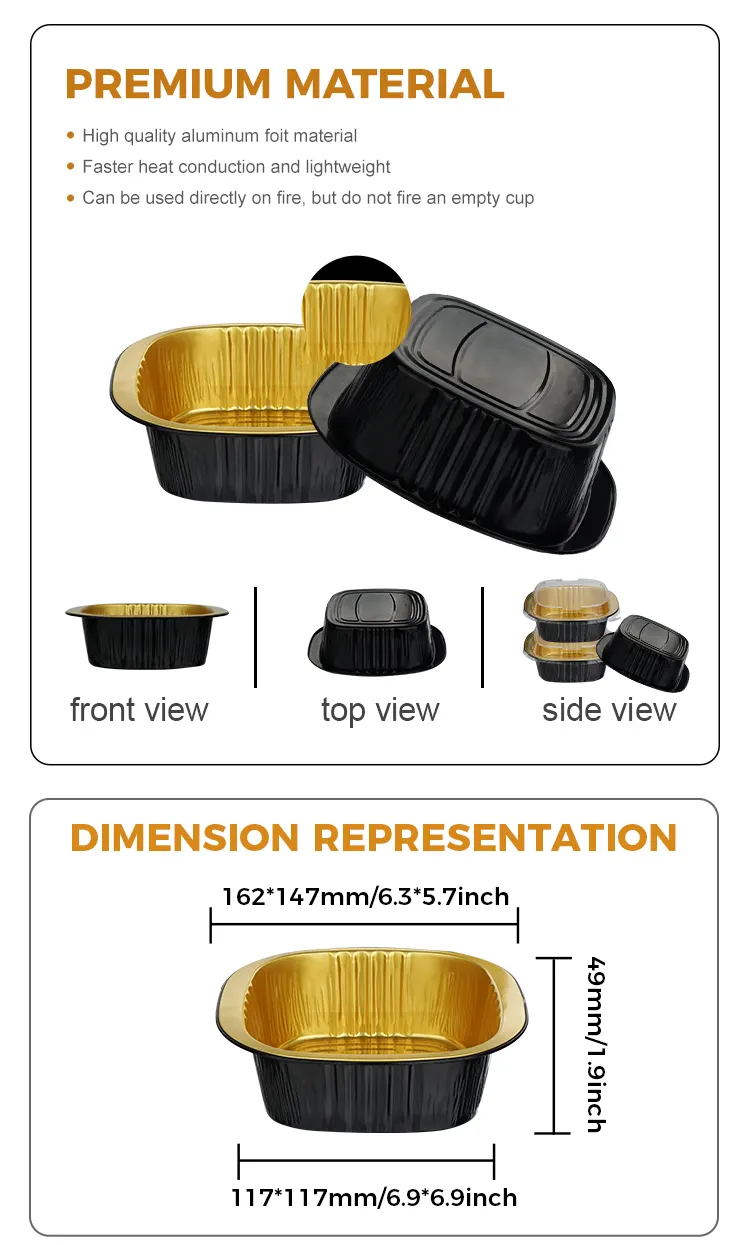 Yunchu Aluminium Foil Supplier capacitatis binauralis capsulae quadratae nigrae, continentes ffoyle aluminii levis muratas factae sunt cibi-gradus 8011 aluminium mixturae ffoyle. Agitur de processibus calidis furnum et sterilizationis, quae densam oxydatum in superficie iacuit formant. Nulla sunt metalla gravia, nullum odorem habent. Omnes cibi genera directi contactum esse possunt et praecipitatio substantiarum nocivarum in calidis caliditatibus impedire. Utrum adhibeantur ad habendum fercula calida, frigora fercula, demerita vel condimenta, possunt cibum tueri salutem et multiplicibus certificacionibus salutem parere sicut FDA et SGS, omni morsu securiores faciens. Unicum lumen nigrum aurum muri designans textura taediosae traditionis aluminii foil frangit continentibus. Matta nigra aurum coating et superficies levis paries sensum summum finem afferunt. Non solum egregiam speciem habet, potest etiam efficaciter impedire lucem et oxygenium, oxidationem cibi morari, in odore cibi et humore firmiter cohibere, translationem odoris vitare, gustum primigenii cibi diu retinere. Superficies murus levis non habet striatos aut rugas, eo minus probabile bacteria generare et mundare facile est. Potest etiam melius accommodare ad customizationem excudendi, notas praebendas adiuvandas ut eorum recognitionem et qualitatem augeant.