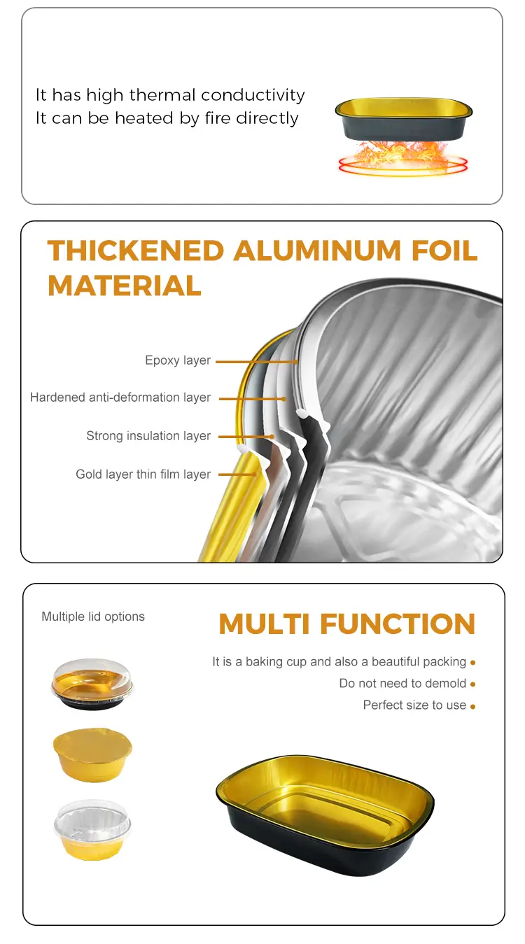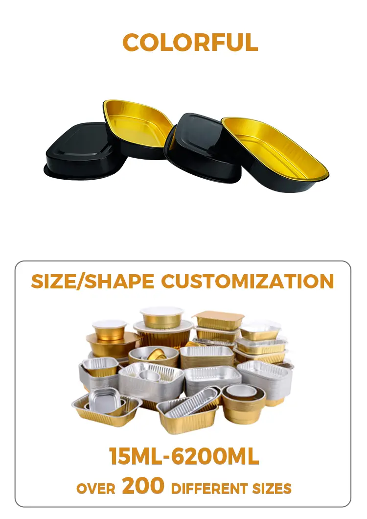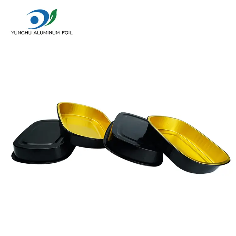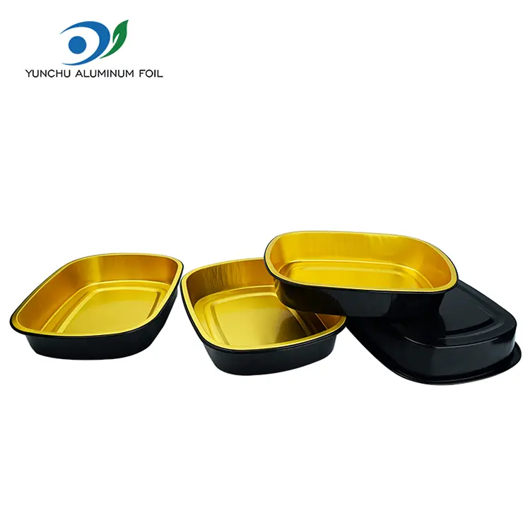 Sinis Yunchu Aluminium Foil Custom PROMPTU Nigrum Aurum Pistoria Tray rectangulum Aluminium Foil Containers potest directe posuit in clibano, barbecue Grill et refrigerator. Productum lucem pondus facile reclinant eleganter efficaciter salutaris translationem, popinae et familia spatium. Productum est de lumine muro technology, lenis et servetur. Est convenient ad magnum supermarkets ad label et scan codes. The product has a large capacity, can be loaded with most large food, the product is a disposable, no need to clean to save labor costs, the product is used with aluminum foil PET cover and aluminum foil heat sealing film, no oil leakage, no water seepage, high temperature resistance and no deformation, improve the freshness and heat preservation of the product to food, and the transportation effect will be better when sealed. Obsequium ios9001 et sgs cibum contactus signa, Coba products sunt propagationem totus super orbis terrarum.