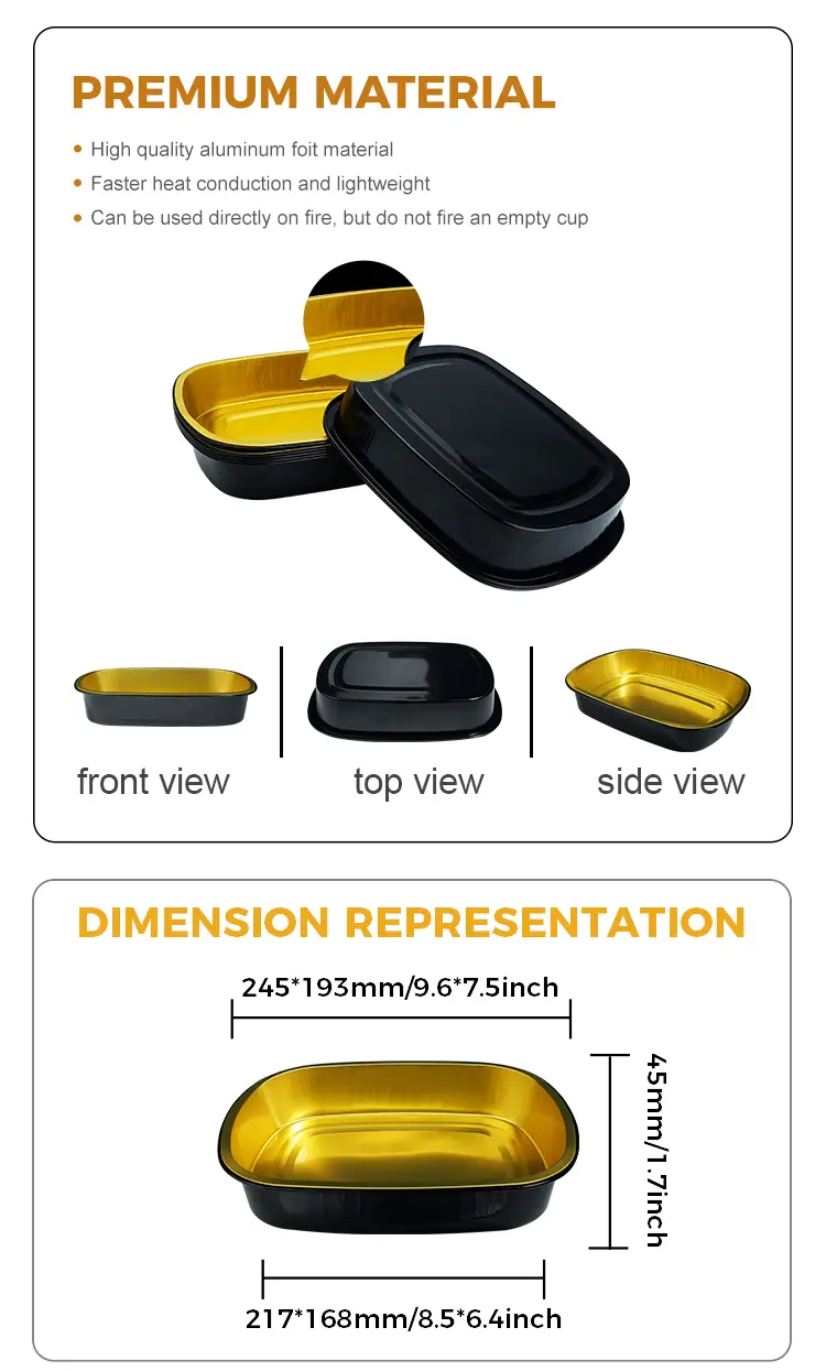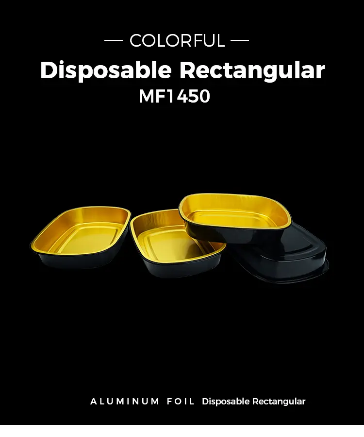 Yunchu aluminum foil supplier Disposable black gold baking tray Rectangular Aluminum Foil Containers MF1450 is suitable for large-scale catering, especially suitable for canteen catering, restaurant chain stores and refrigerated food distribution and other scenarios, this product is made of high-strength aluminum foil material, low height is suitable for some turkey, grilled fish, stewed and other ingredients of food Ad locum, fortis scelerisque conductivity potest paro altum temperatus, ut cibus est aequaliter succensa, cum bono onus-afferentem facultatem et compressive perficientur, ut non facile ad extrude et deformare per translationem, potest adhiberi ad extrude et deformare in ut non sit facilis ad extrude et deformare in vehicula et plastic lid.