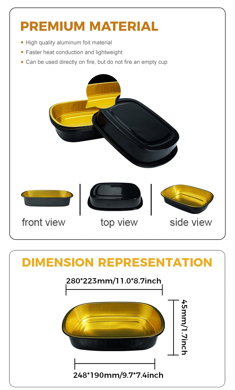 Yunchu Aluminum Foil Supplier Disposable black gold catering Rectangular Aluminum Foil Containers is suitable for large-volume catering and takeaway industries, especially suitable for baking, catering chains and self-service chains and other scenarios, the product is made of 8011 food-grade aluminum foil material, the height is low and suitable for some turkey, grilled fish, stew and other foods with many ingredients Ad locum, potest esse cum aluminium ffoyle signantes operculo et pet plene transparent operculo, cum optimum signantes perficientur, summus temperatus resistentia et oleum et Leak praeventionis munus. Est late in variis missionibus ut cibum packaging, calefacit, refrigerationem et takeaway partum. Superficiem induit lucem murum consilio cum plana et lenis speciem, quae est convenient automatic signati calor, signatum film, ita improving packaging efficientiam.