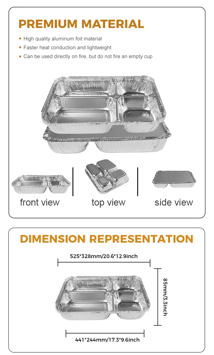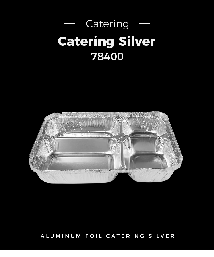Yunchu Aluminum Foil Supply Factory launched a new Disposable multi-compartment fast food Silver Aluminum Foil Containers, model number 78400. The container is cleverly designed, with an upper diameter of 244 mm (9.6 in) and 195 mm (7.6 in) and a lower diameter of 217 mm (8.5 in) and 168 mm (6.6 in), with an overall height of only XLI mm (1.6 in). Et facultatem circa MXX ml (36.0 oz), id est conveniens et practica ad tenentes varietate ciborum quatuor cameras.