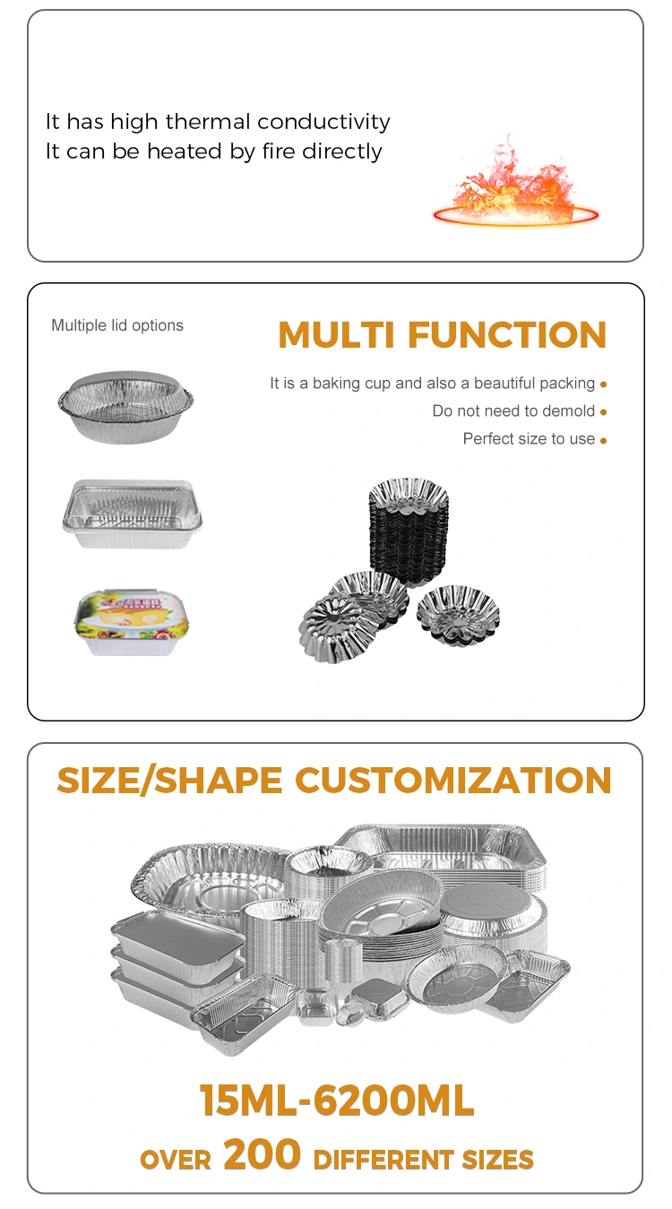 wholesale products, aluminum foil material, safe and non-toxic, made of aluminum foil food-grade material, with good thermal conductivity, safe and non-toxic uses are rich and diverse, so that you can use it more at ease, easy to remove the mold when using high temperature, after the finished product is completed, easy to remove the film, non-stick bottom, do not damage the shape, thicken and harden the material is not easy to deform, good pressure resistance, say goodbye to the trouble of washing the pot and easily protect the pot, isolate oil stains after use, do not need to be cleaned, smooth bottom is not easy to burn and stick to the bottom, non-stick food is easy to cook, The bottom is smooth, it can withstand -20°C~300°C, can be heated by open flame, and the mold is heated evenly.