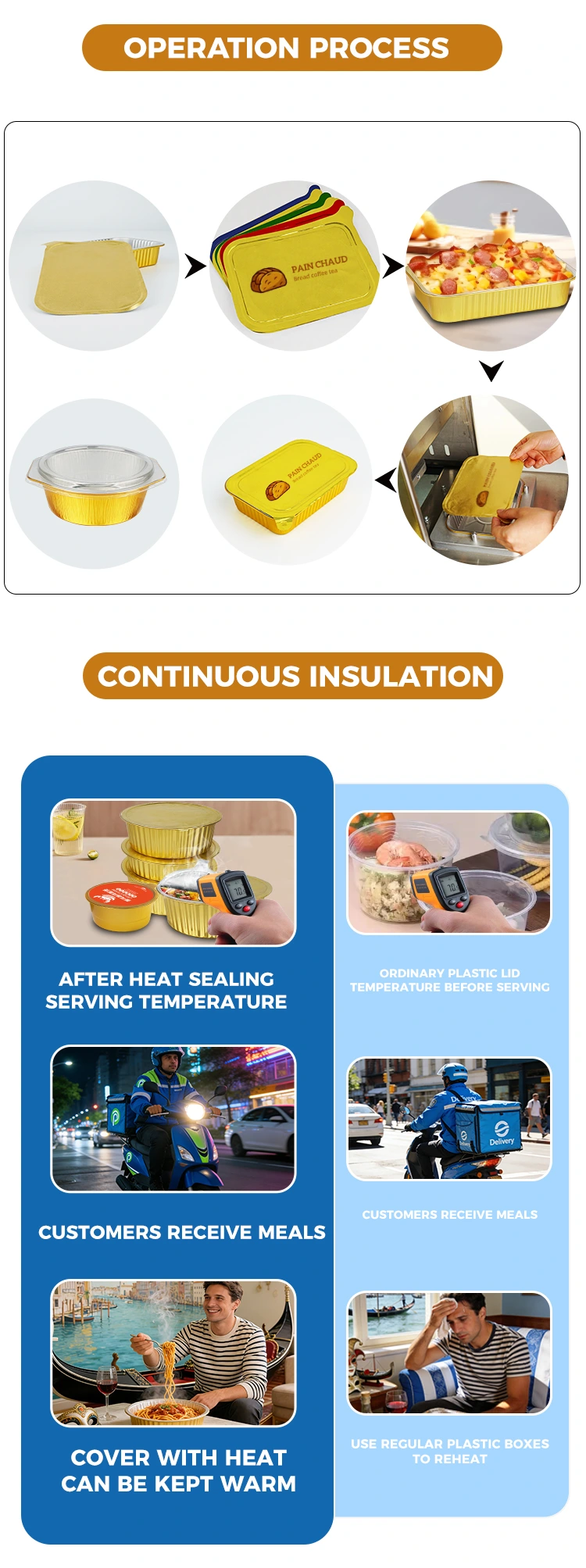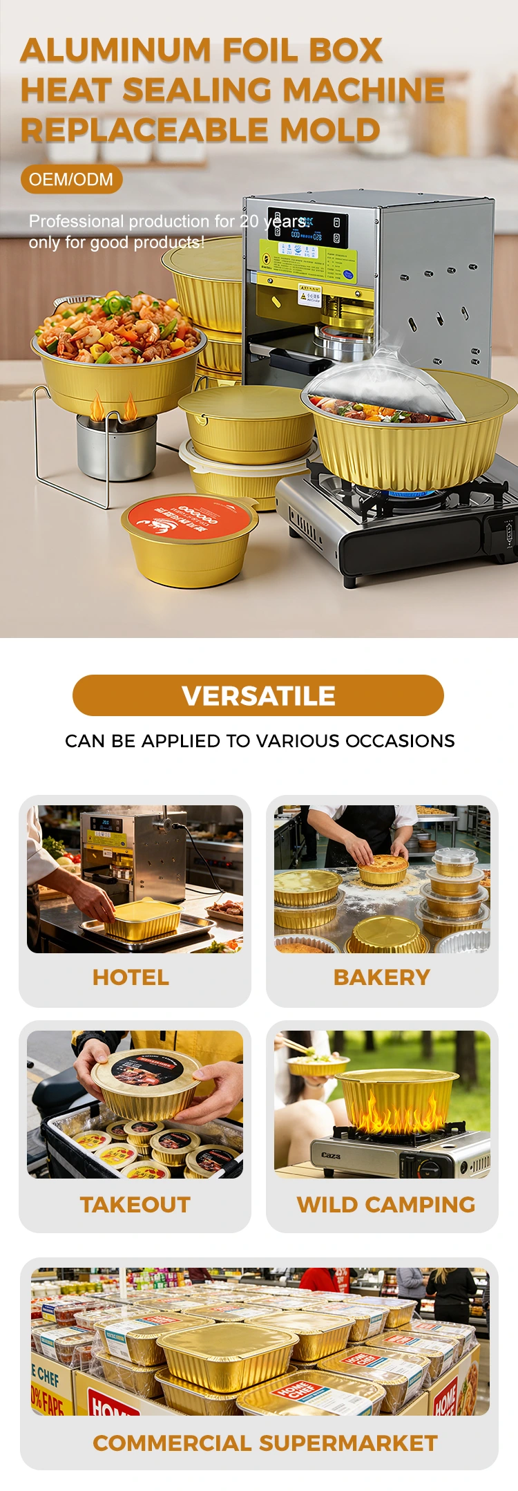Yunchu officinam suam habet et est fabrica et copia caloris manualis machinae signandi cum auro Aluminium Foil Vasa in Sinis. Materias cibi-gradus adoptat et tuta est ac libera libera. Aluminii foil /PP materia cibaria facta, probata salus auctoritativa praeteriit, inodora est, renitens calidis et infimis (-20℃ ad 220℃), et potest directe calefieri in proin, coctum in clibano, vel congelatum pro repositione, occurrens varias processus et conservationes necessitates ciborum, et providens consumers cum valido securitatis sensu.
