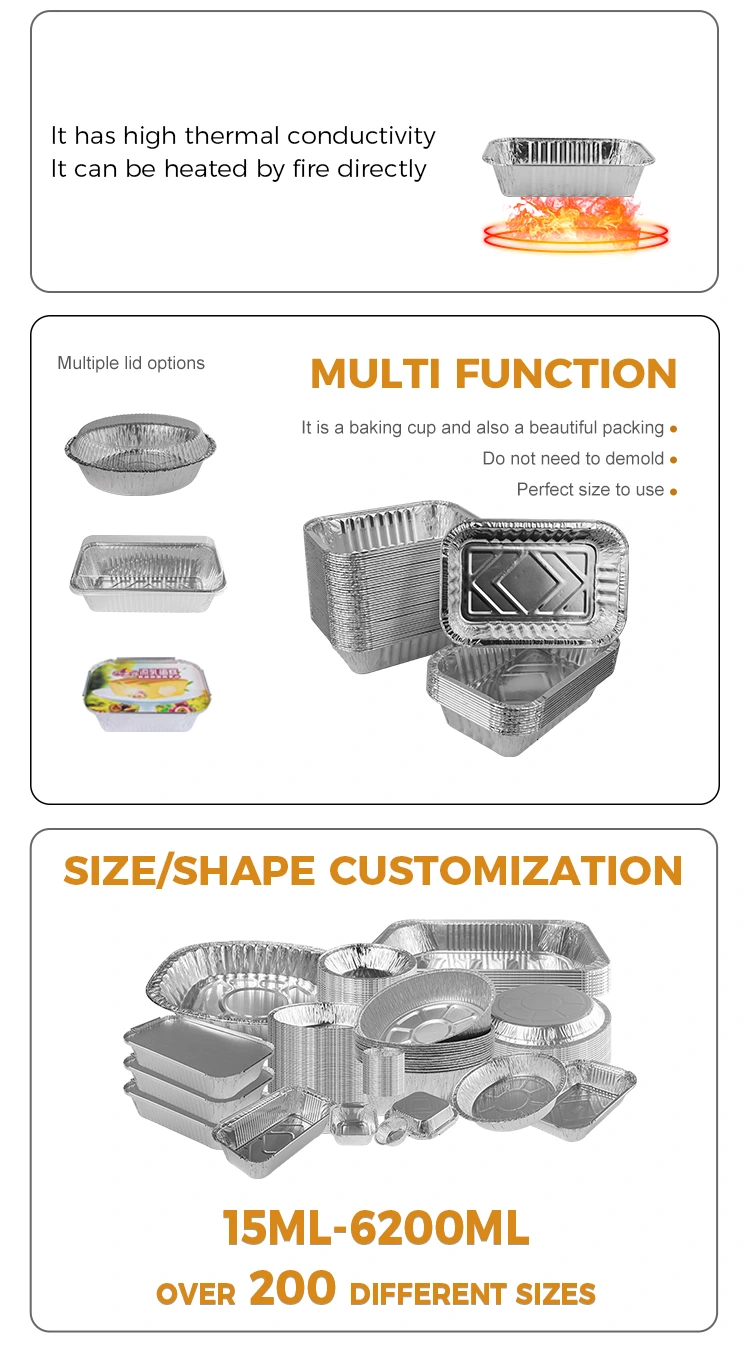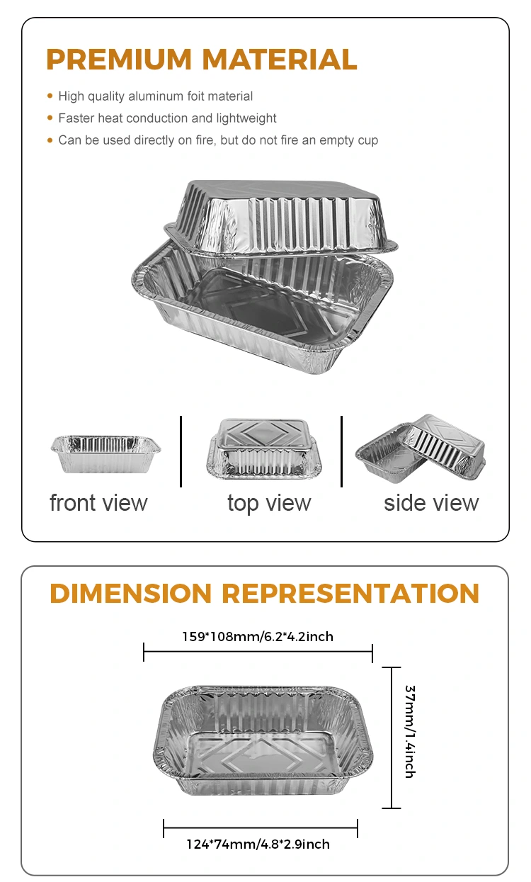 In MMCCCXXII rectangulum PAPKING Pan Silver Foil Continens ex Yunchu Aluminium Foil Foil Foil Foil Foil Foil materiam, salus et odorem natura cibus. Quod productum est mundus-liberum et recyclable, dans magis pacem mentis cum usura est. Non habet dimensiones de CLIX mm (6.2 in) et CVIII mm (4.2 in) superius diametri, CXXIV mm (4.8 in) et LXXIV mm (1.4 in), et capacitatem XXXVII (1.4 in), et capacitatem XXXVII (1.4 in), et capacitatem XXXVII (1.4 in), et in capacitatem, XXXVII mm (1.4 in), et capacitas circiter CD ml (14.1 XXXVII) Circiter Circiter CD ML (14.1. Aluminium ffoyle boxes habere optimum calor conservationem munera, praesertim idoneam ad temperatus imperium in takeaway et shopping pretium cibum, utrum sit parva panes aut fructus materiae.