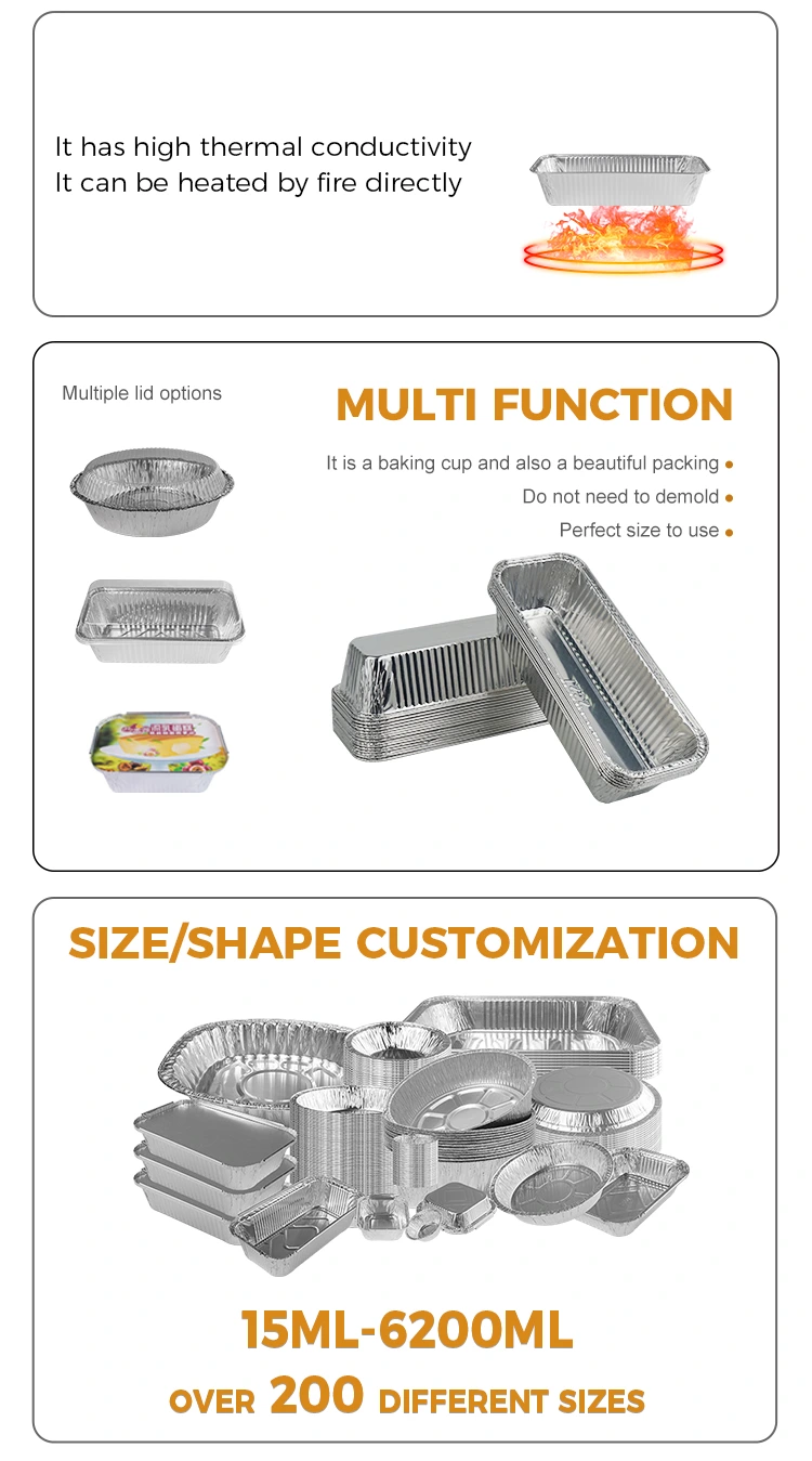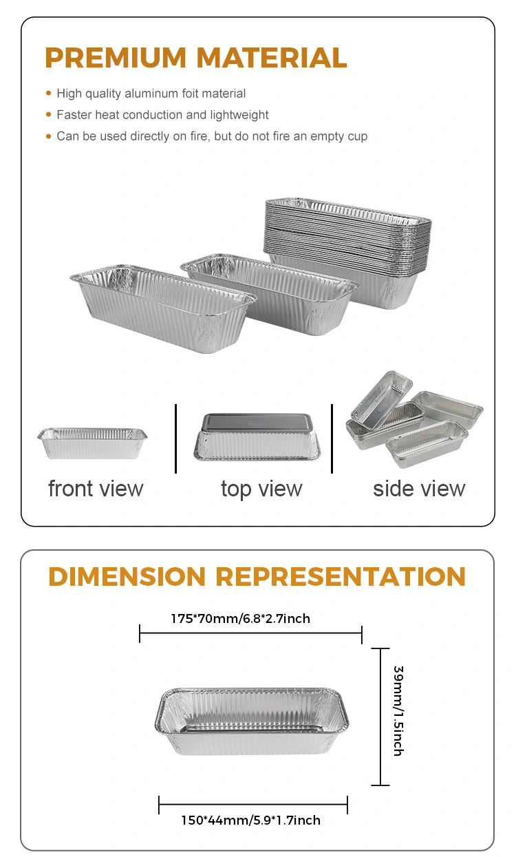 Rectangulum panis Tray Silver Aluminium Foil Containers provisum a Yunchu Aluminium Foil Foil Foulfus est de cibo-gradus materiae et idoneam ad varietate application missionibus. Hoc productum est praecipue idoneam ad grilling et pistoria proposita, ut faciens longum panes vel pistoria. Utrum suus 'ad carbonibus grilling vel ut a takeaway partus buxum, illud perfectum ad usum.