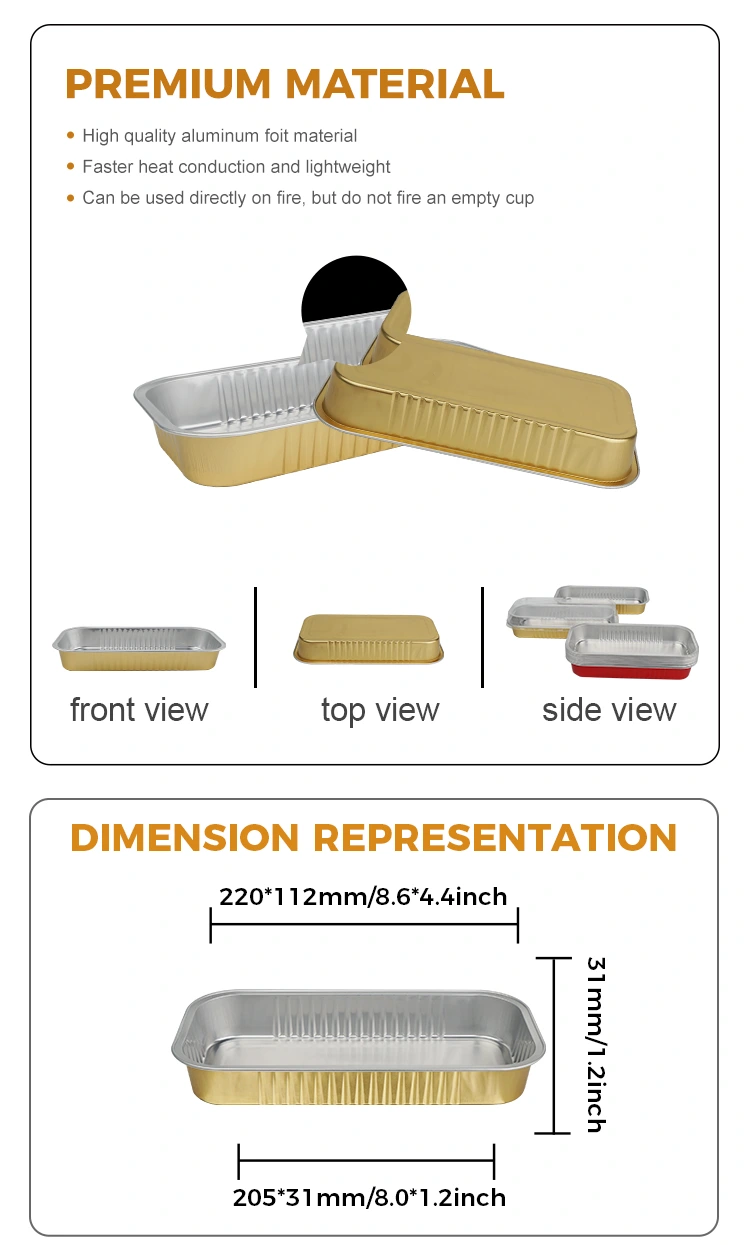 Yunchu aluminium ffoyle praebet Rectangulum aureum coquendum Smoothwall Aluminium Foil Vasa, quae non solum ad missiones coquendas sed etiam ad takeout aptas sunt, et etiam te iuvare possunt cum repositione quotidiana;