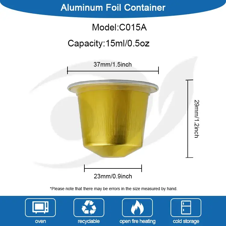 Yunchu Aluminium Foil Suspendisse Silicone-Sigillum Vacua Capulus Capsula C015a in sequentibus magnitudinum: Top Diameter XXXVII mm (circiter 1.4 pollices), XXIII mm (circiter 0.9 (circiter (circiter 1,1) altitudo XXIX mm (circiter 1.1 (circiter (circiter 1,1 (circiter (circiter 1.1 (circiter (circiter 1,1 (circiter (circiter 1.1 (circiter (circiter 1.1 (circiter (circiter 1.1 (circiter (circiter 1.1 (circiter (circiter 1.1 (circiter (circiter 1.1 (circiter (circiter 1,1. Haec capsule tenet XV ml (circiter 0,5 oz) de terra capulus, capulus liquore. Apta omnes Nespresso machinis, packaged Espresso Liquid, et potest etiam extenditur NITROGENIUM Rinsing. Insuper et logo et colore potest etiam esse nativus, et forma potest typis in aluminium ffoyle operimentum, et logo potest etiam in fundo capulus capsula.