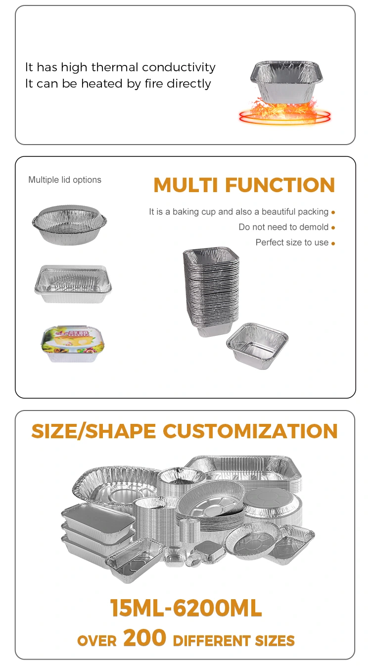 Yunchu Aluminium Foil Square Aeris Fryer Silver Aluminium Foil Containers quod potest esse in aere fryers, parva liba, parva cibo loading, takeaway partus, etc., et potest esse in sauces exemplaria. To ensure that the small capacity aluminum foil container loaded in the container is fresh, it is made of 8011 food-grade silver aluminum foil material, which is integrally molded, and the wall surface is smooth and clean like a mirror, which is both beautiful and practical, and the edging design does not hurt your hands, and the size is rich and suitable for a variety of scenes.