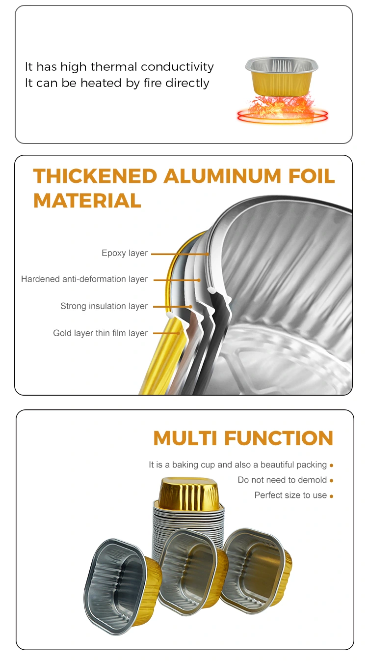Disposuerat ut tam pulcher et muneris esset, Quadrata mensa poculis coquendis teres Aluminium Foil Continens ordinatur ad altas temperaturas sine evacuatione sustinere. Ea e materia 8011-0 constituitur et calorem maximam renitentem temperaturam usque ad 660°C habet. Apparatus generalis coquinae etiam CC°C attingere potest, ut cibus non uratur aut resiliat. Quia ex materia crassa, multiplex temporibus adhiberi potest. Tota res cum quattuor ordinibus technicae artis processit. Post coctionem, eam colligere potes, et sine cura deformatio comede. Insuper etiam commodissimum est ad purgandum, et medicamenta tueri directe potes hygiene.
