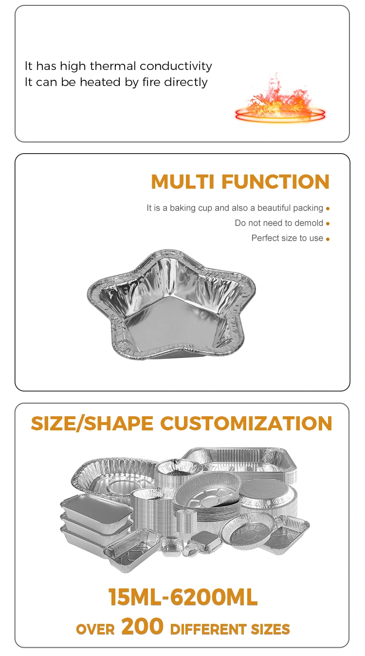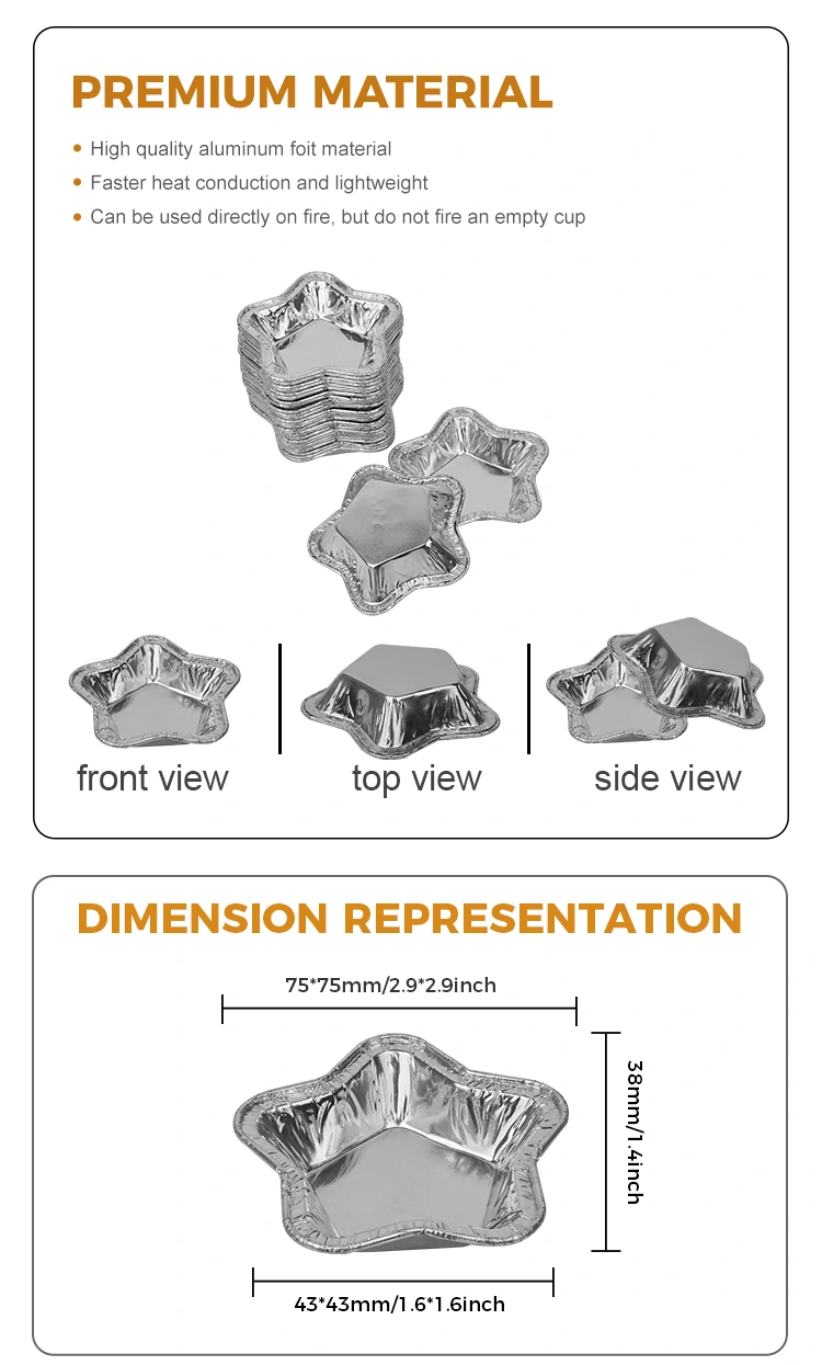 Calices stellae informes aluminii ffoyle ex argento aluminium ffoyle fiunt et resistentiam altam habent, stabilis inter -20°C et 300°C manens. Aptae sunt ad coquendam et aerem usum fryer, et detrimentum facere possunt ad muros interiores applicationis. Sunt efficiendi, ut nulla purgatio requiratur.